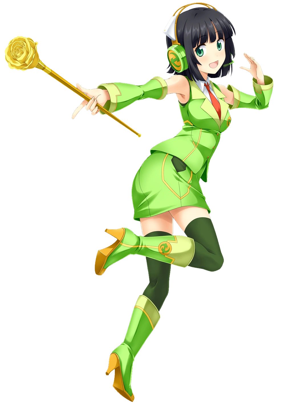 Seika wears a sleeveless business-or-office-like attire. Her outfit is primarily green; her jacket, arm sleeves, skirt, and boots are all a lime green color, and she wears darker green thigh-high socks to go with it. She wears a green headset with white cat-ear like tips, and she wields a golden staff with a yellow rose at the tip in her boxart.